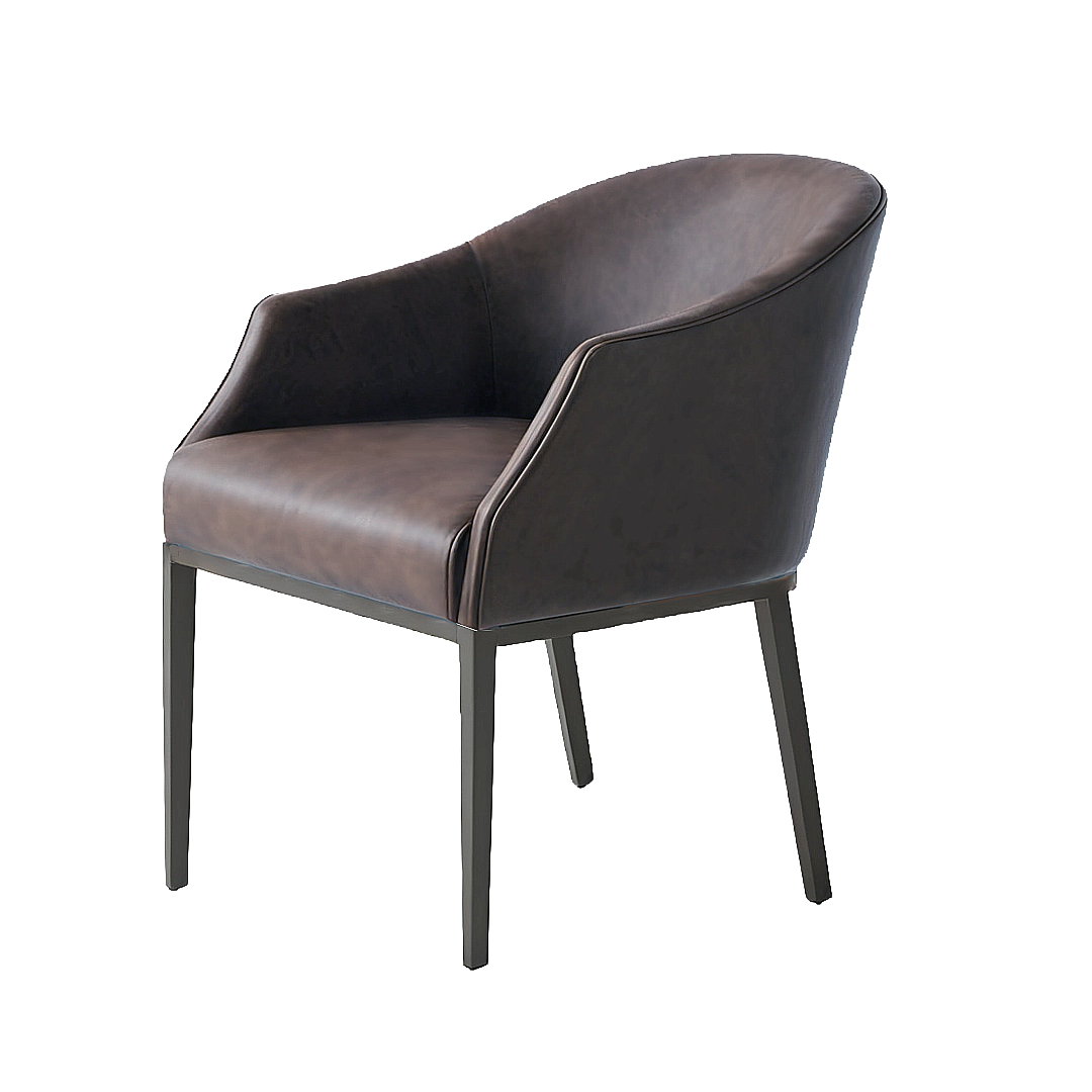 Commanding yet graceful, this modern dining chair features a sculpted barrel back that envelops the body with tailored comfort.
