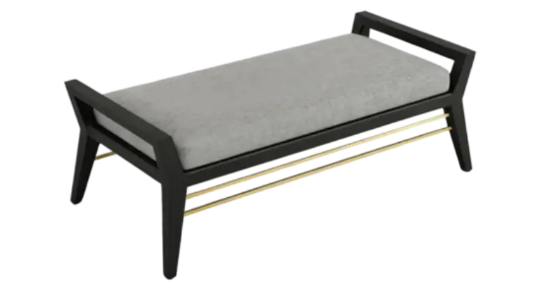 Bold and architectural, this bench pairs angular arms with a brass stretcher for a modern, grounded feel.